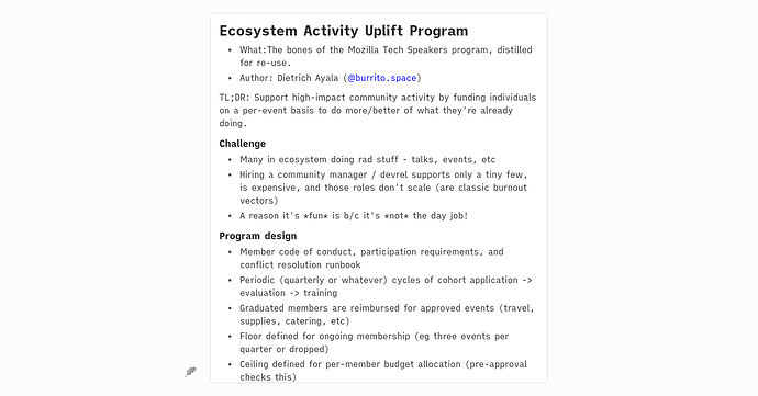 Dietrich was kind enough to describe the Mozilla Tech Speakers program he created and ran, where the people around the world already promoting Mozilla/ Firefox / etc got support to give talks.