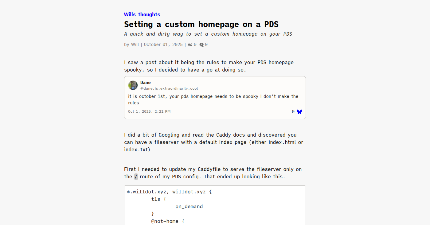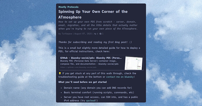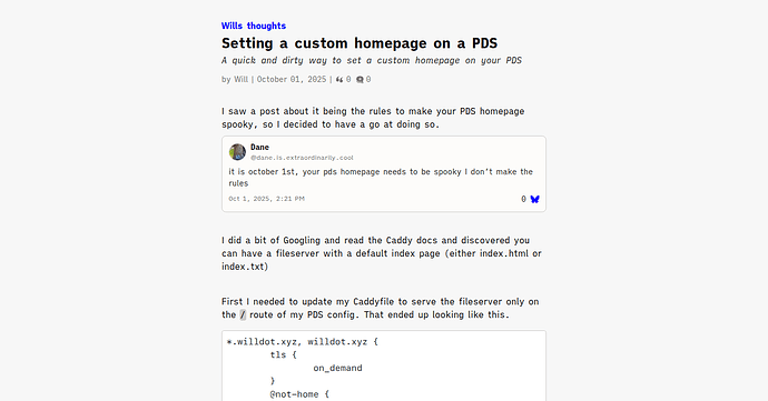 i’d also like to note that you can pretty much do anything with a custom homepage, be it a static page with calls to the PDS API (that’s what i do to get an active PDS user list on the katproto homepage), or something fully dynamic, like pds-dash (though i haven’t used this so i can’t say much about how it works, just that it looks cool!)