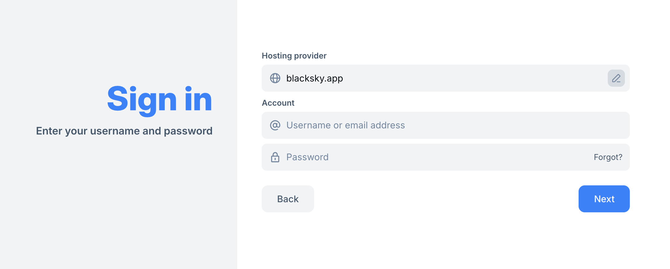 The sign in screen has a Hosting provider label that defaults to Bluesky Social. Click the pencil edit icon.