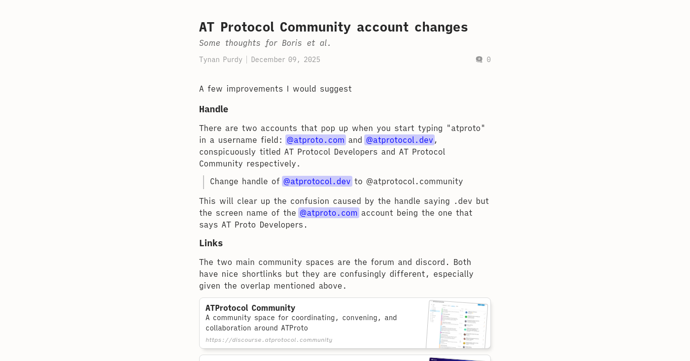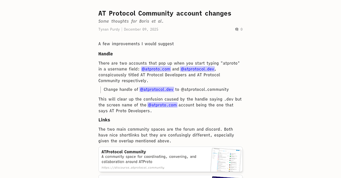 I realize as I go through all of this that the web blog is at atprotocol.dev and there is nothing at atprotocol.community. I think as this community grows we will need to quickly shed any focus exclusively on devs.